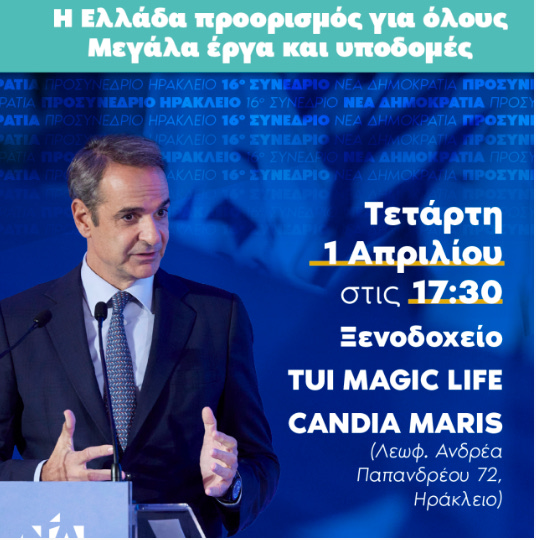 «Σας προσκαλούμε στο Προσυνέδριό μας στην Κρήτη, το οποίο θα διεξαχθεί την Τετάρτη 1 Απριλίου 2026, στις 17:30, παρουσία του προέδρου της Νέας Δημοκρατίας και πρωθυπουργού, Κυριάκου Μητσοτάκη, στο Ξενοδοχείο TUI MAGIC LIFE CANDIA MARIS, στην αίθουσα “ΜΙΝΟS” (Λεωφ. Ανδρέα Παπανδρέου 72, Ηράκλειο)».