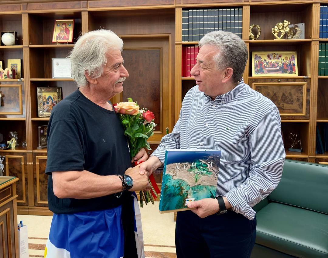 Τον αθλητή υπεραποστάσεων, Θεοχάρη Αθητάκη, υποδέχθηκε σήμερα, στο κτήριο της Περιφέρειας, ο περιφερειάρχης Κρήτης, Σταύρος Αρναουτάκης, με αφορμή την ολοκλήρωση της ιστορικής διαδρομής 153 χιλιομέτρων που πραγματοποίησε ο αθλητής από την Ανώπολη Σφακίων προς το Ηράκλειο.