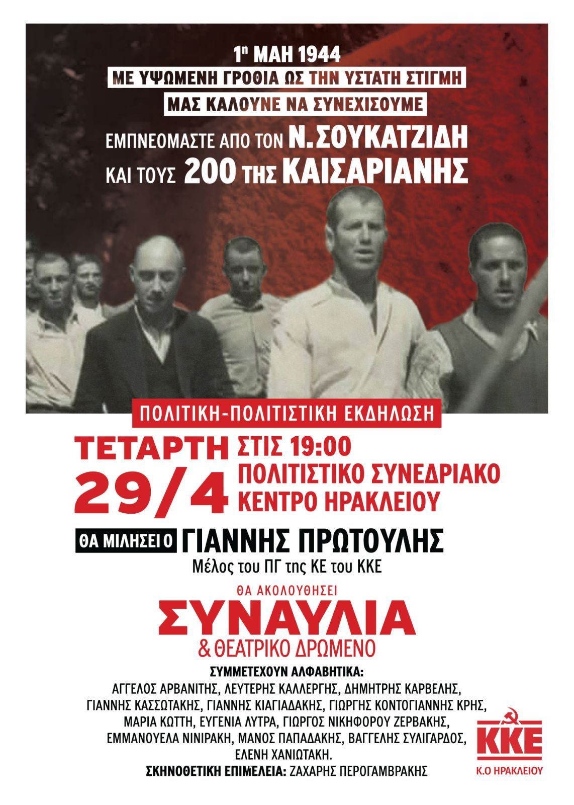 Μια μεγάλη εκδήλωση για την ηρωική εκδήλωση των 200 κομμουνιστών, 82 χρόνια πριν, την Πρωτομαγιά του 1944, στα ιερά χώματα της Καισαριανή, οργανώνει αύριο, Τετάρτη 29 Απριλίου 2026, στις 19:00, στο Πολιτιστικό Συνεδριακό Κέντρο Ηρακλείου, η Τομεακή Επιτροπή Ηρακλείου του ΚΚΕ.