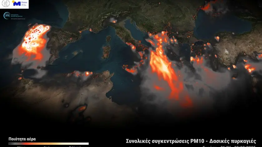 Ιδιαίτερα ανησυχητική ήταν η κατάσταση της ατμόσφαιρας στη Μεσόγειο το καλοκαίρι του 2025, καθώς οι εκτεταμένες δασικές πυρκαγιές επέφεραν σοβαρή επιβάρυνση της ποιότητας του αέρα. Σύμφωνα με την ανάλυση της μονάδας METEO του Εθνικού Αστεροσκοπείου Αθηνών και τα δεδομένα του Copernicus (CAMS), οι περιοχές με τη μεγαλύτερη συγκέντρωση αιωρούμενων σωματιδίων PM₁₀ ήταν η Ιβηρική Χερσόνησος, τα Βαλκάνια και ιδιαίτερα η Ελλάδα.