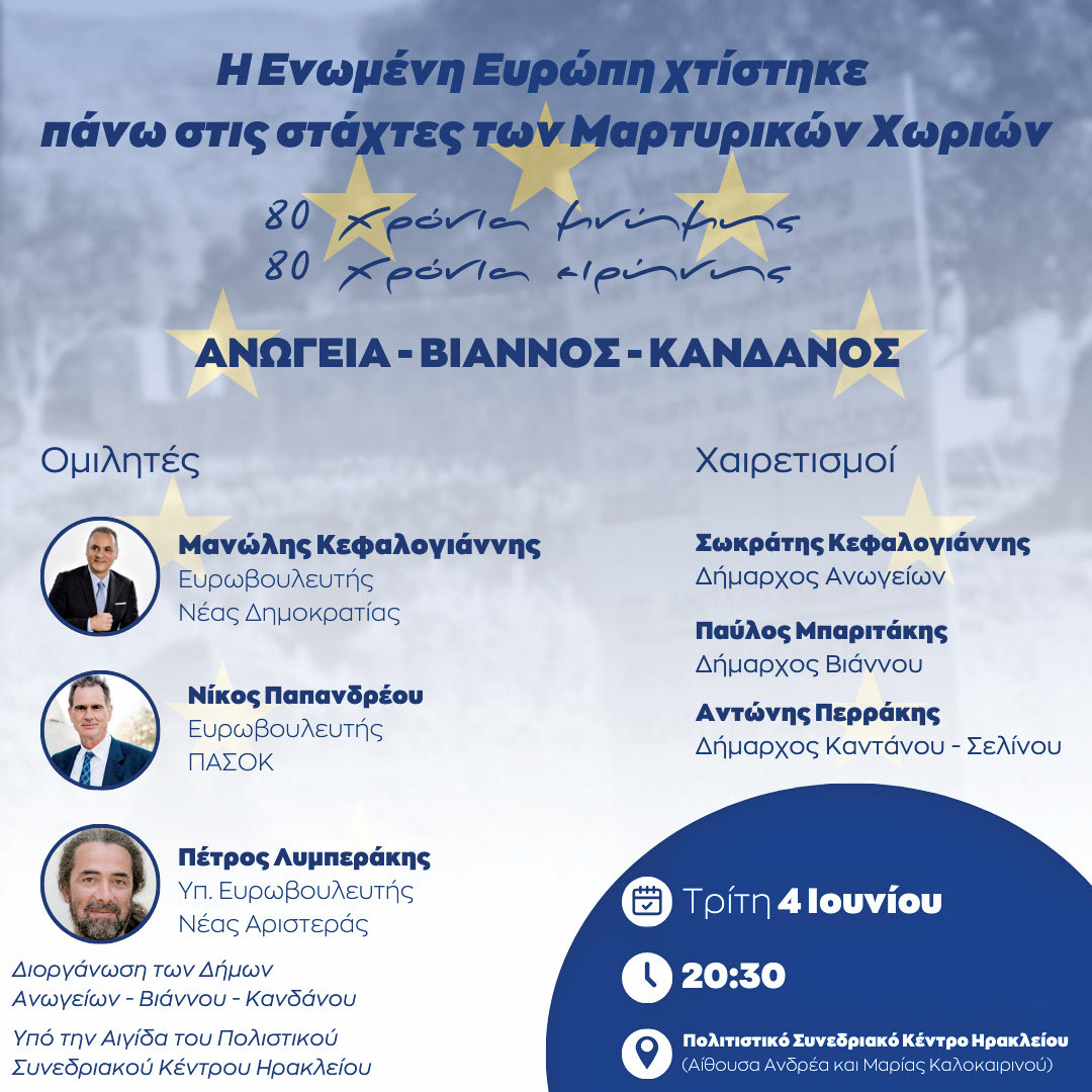 Μια μεγάλη εκδήλωση για τα μαρτυρικά χωριά οργανώνεται την Τρίτη 4 Ιουνίου στο Πολιτιστικό Κέντρο Ηρακλείου. «Η ενωμένη Ευρώπη χτίστηκε πάνω στις στάχτες των μαρτυρικών χωριών- Ανώγεια- Βιάννος- Κάνδανος» είναι το θέμα της εκδήλωσης στο οποίο θα κληθούν να μιλήσουν οι υποψήφιοι ευρωβουλευτές Μαν. Κεφαλογιάννης (ΝΔ), Νίκος Παπανδρέου (ΠΑΣΟΚ) και Πέτρος Λυμπεράκης (Νέα Αριστερά). Χαιρετισμούς θα απευθύνουν οι δήμαρχοι Σ. Κεφαλογιάννης, Π. Μπαριτάκης και Αντ. Περράκης.