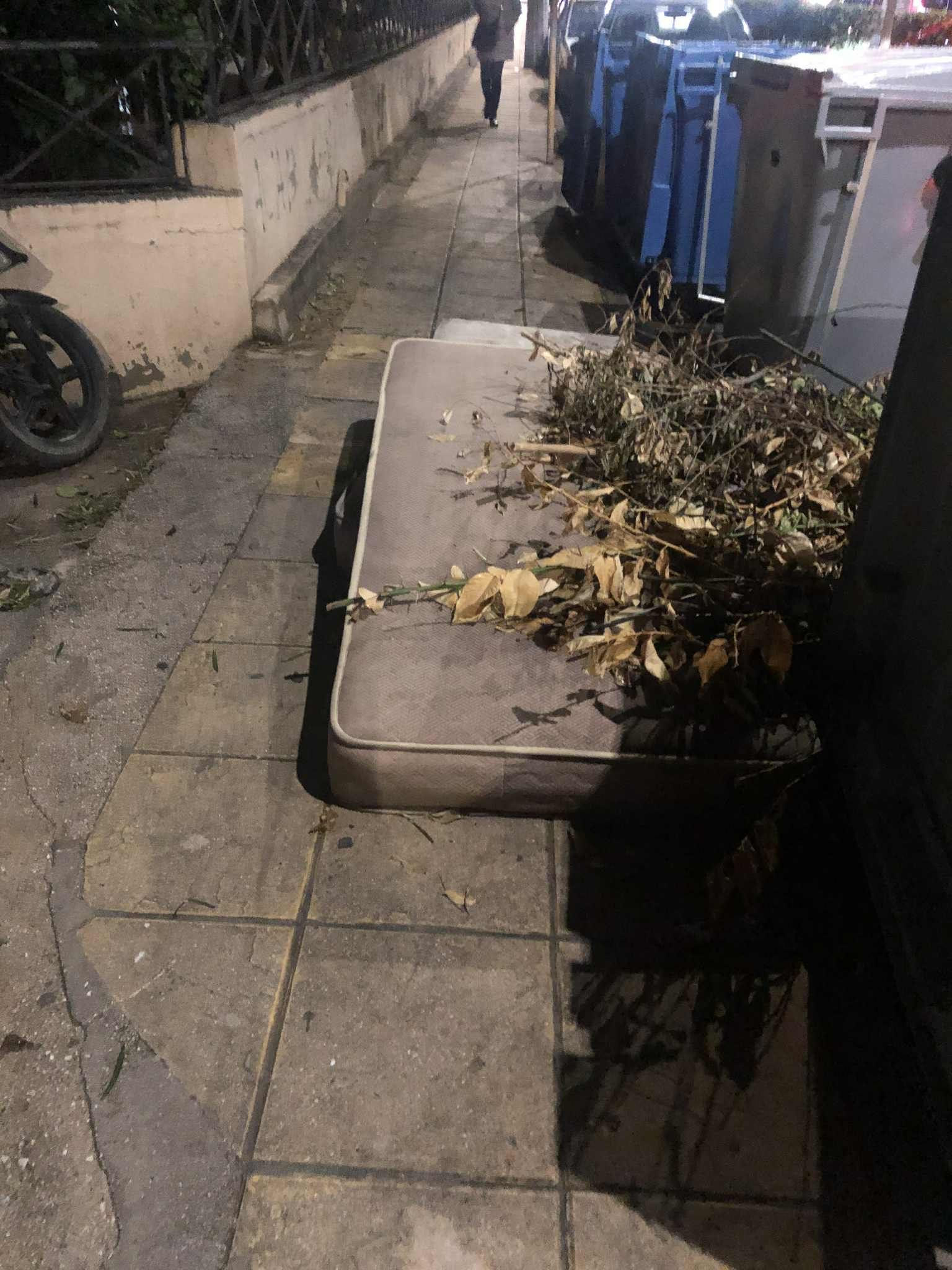 Όσο και αν φταίνε οι ασυνείδητοι δημότες -που δεν είμαι και τόσο σίγουρος, καθώς μια φίλη μου επικοινωνούσε με τον Δήμο 5 μήνες για να παραδώσει ένα στρώμα!- η Λότζια έχει τη δική της ευθύνη για την παραπάνω αλγεινή εικόνα, επί της οδού ΕΟΚ στην Πεταλοειδή, όπου δύο στρώματα καλύπτουν εδώ και δύο μήνες το μισό πεζοδρόμιο, αλλά ουδείς ασχολείται. Περίοικοι μάς είπαν ότι επικοινωνούν συνεχώς με τη Λότζια, αλλά τίποτα.