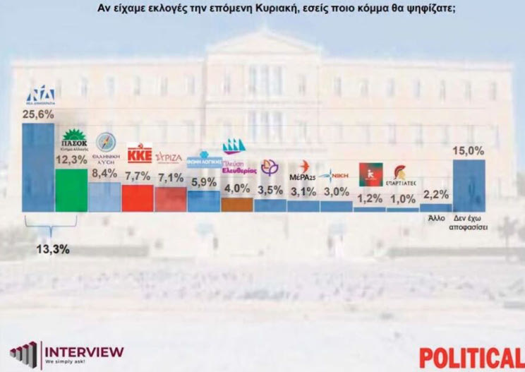 Προβάδισμα 13,3 μονάδων δίνει στην Νέα Δημοκρατία, νέα δημοσκόπηση της εταιρείας Interview για την Political.