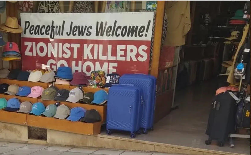 Το πανό έγραφε “Peaceful Jews Welcome – Zionist Killers Go Home”, δηλαδή, «Οι φιλειρηνικοί Εβραίοι είναι καλοδεχούμενοι, σιωνιστές δολοφόνοι πηγαίνετε σπίτια σας». Σύμφωνα με την καταγγελία του ιδιοκτήτη του καταστήματος, ο Ισραηλινός τουρίστας επιχείρησε να κατεβάσει το πανό και στη συνέχεια άσκησε βία κατά της ιδιοκτήτριας, αλλά έσπασε και ένα σταντ με καπέλα προτού αποχωρήσει. Σύμφωνα με την καταγγελία, ο σύζυγος της ιδιοκτήτριας κάλεσε την Αστυνομία και υπέβαλε μήνυση, καθώς κάμερες των διπλανών καταστημάτων κατέγραψαν τη δράση του.