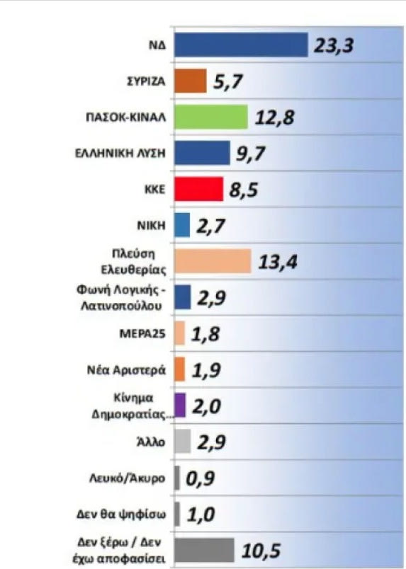 Στο ερώτημα «αν αύριο είχαμε βουλευτικές εκλογές, ποιο κόμμα είναι πιο πιθανό να ψηφίζατε», η ΝΔ είναι στην πρώτη θέση με 23,3%, ακολουθεί η Πλεύση Ελευθερίας με 13,4% και στην τρίτη θέση είναι το ΠΑΣΟΚ με 12,8%.