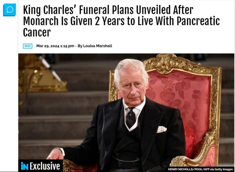 Τώρα ένα νέο δημοσίευμα, αυτή τη φορά στο περιοδικό In Touch, έρχεται να προκαλέσει νέα αναστάτωση στη Βρετανία, καθώς κάνει λόγο για καρκίνο στο πάγκρεας με τον βασιλιά «να έχει δύο χρόνια ζωής», ενώ, όπως μεταδίδει, τα σχέδια για την κηδεία του ετοιμάζονται.