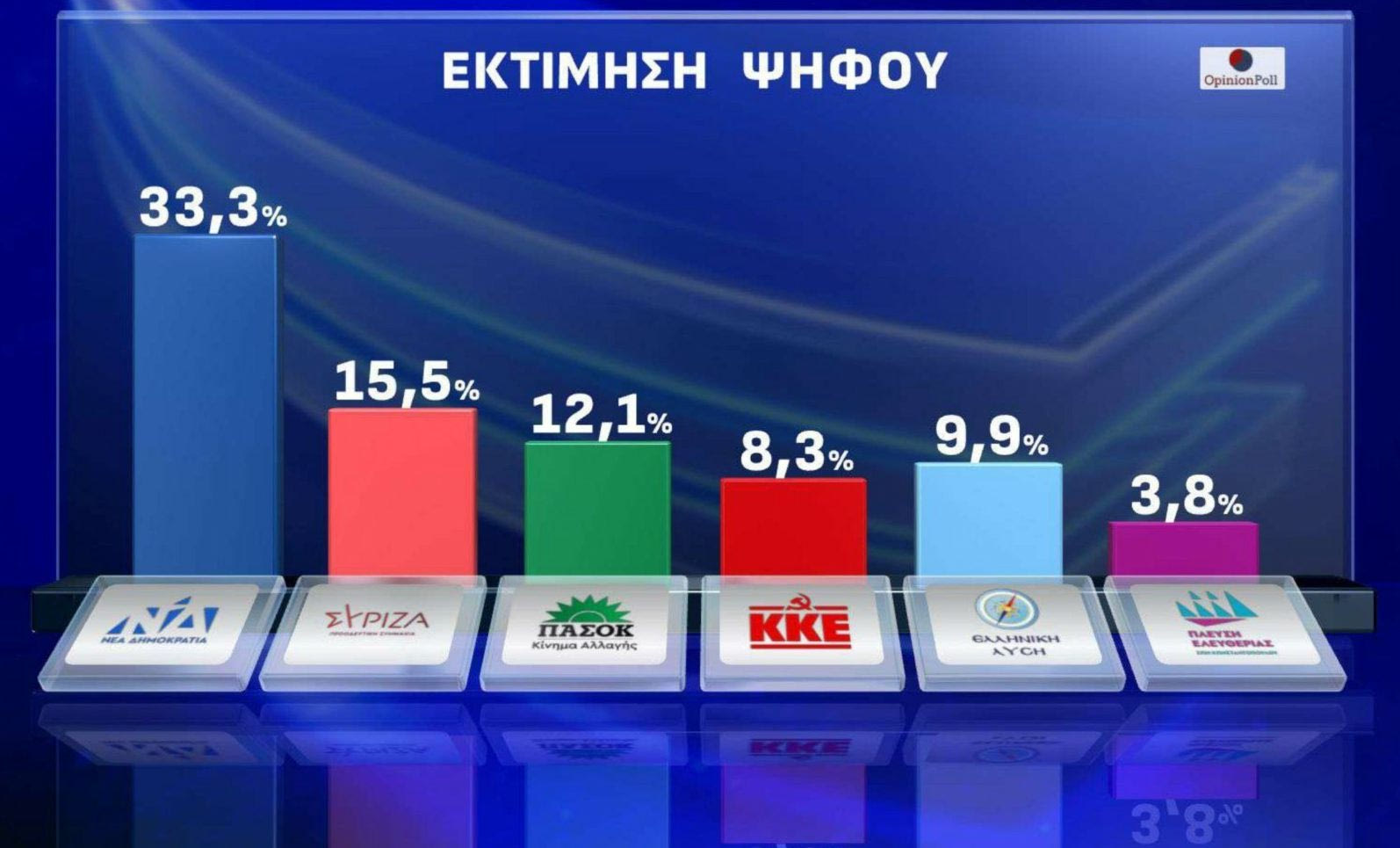 Σύμφωνα, λοιπόν με τη νέα δημοσκόπηση, στην εκτίμηση ψήφου η Ν.Δ προηγείται κατά 17.8% του ΣΥΡΙΖΑ, συγκεντρώνοντας 33.3%, έναντι του ΣΥΡΙΖΑ που εμφανίζει επίδοση 15.5%.