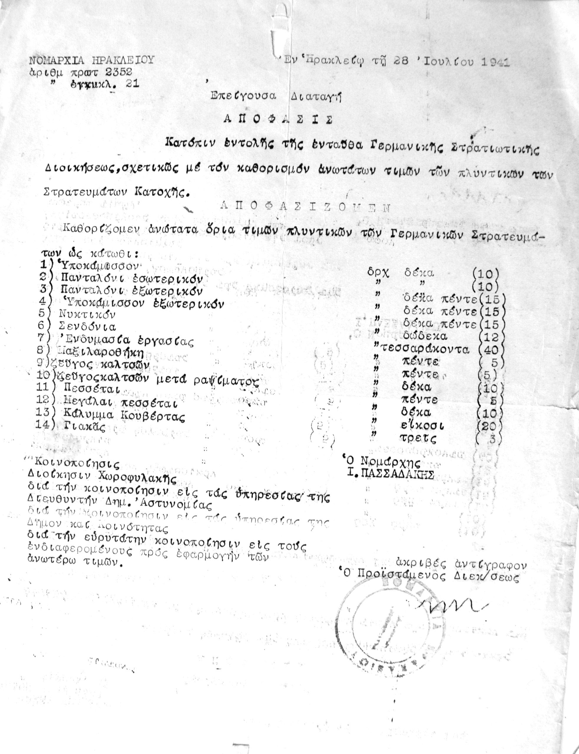Συγχρόνως με τις διαταγές καταναγκαστικής εργασίας, καθορίστηκαν και οι τιμές των «πλυντικών» των στρατευμάτων κατοχής. Τα ρούχα του κατοχικού στρατού έπλεναν στην Κρήτη γυναίκες κυρίως νεαρής ηλικίας. Οι τιμές του πλυσίματος των ρούχων των Γερμανών στρατιωτών και αξιωματούχων ήταν ένα πρόσχημα ώστε να συμμετέχουν στο πλύσιμό τους πολλές γυναίκες. Ποτέ οι κατοχικές αρχές δεν πλήρωσαν το αντίτιμο του πλυσίματος, παρά τις εξαγγελίες τους. Την απόφαση υπογράφει ο νέος Νομάρχης Ηρακλείου Ιωάννης Πασσαδάκης, διορισμένος από τα στρατεύματα κατοχής, αφού ο Νομάρχης Ιωάννης Τσατσαρωνάκης εκτελέστηκε τον Αύγουστο του 1941με την κατηγορία της συμμετοχής του στη μάχη της Κρήτης. Διαβάζουμε στην απόφαση των πλυντικών: «Κατόπιν εντολής της ενταύθα Γερμανικής Στρατιωτικής Διοικήσεως, σχετικώς με τον καθορισμόν ανωτάτων τιμών των πλυντικών των Στρατευμάτων Κατοχής.