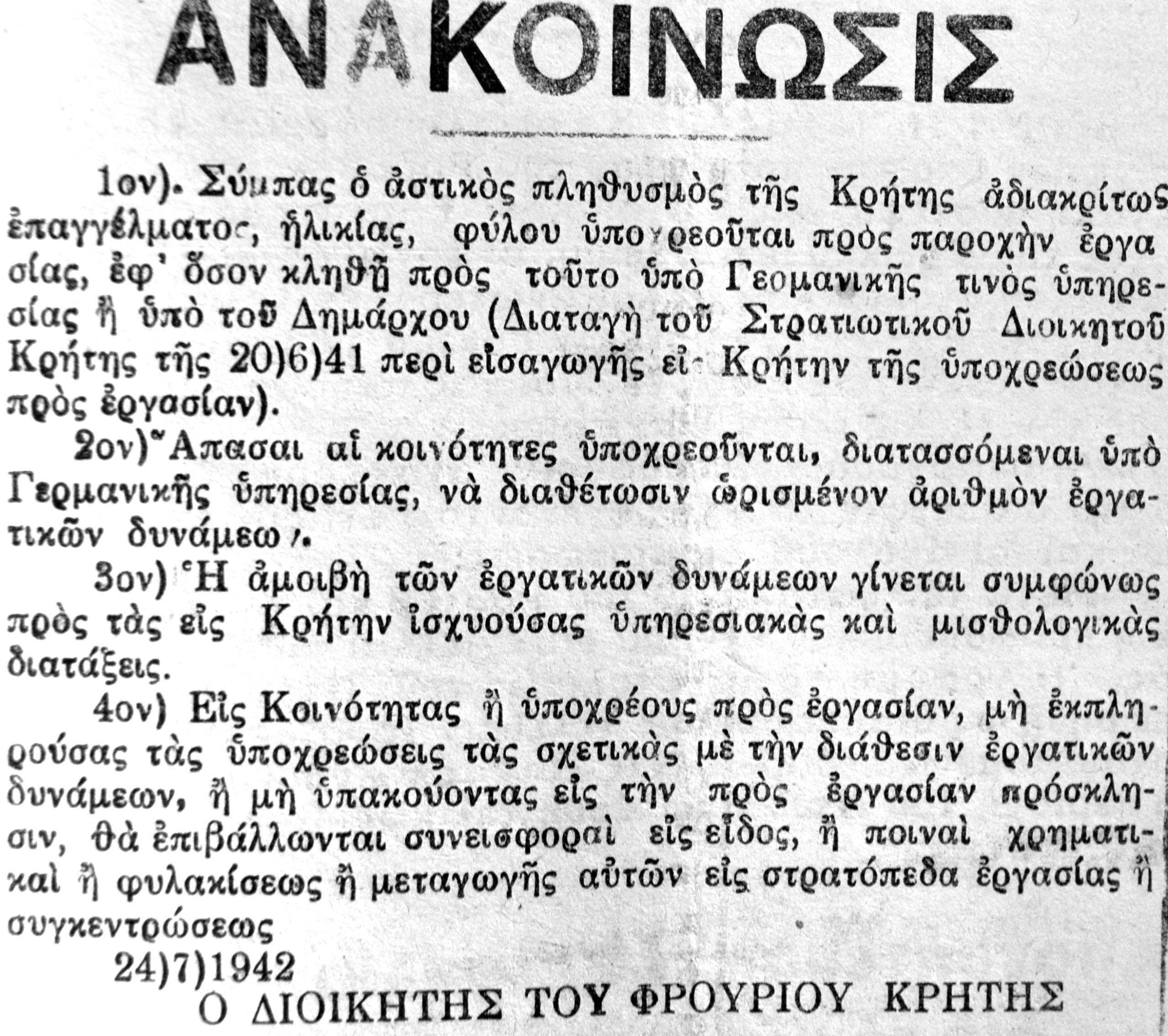 1) Άπαντες οι κάτοικοι Κρήτης ανεξαρτήτως ηλικίας, επαγγέλματος και φύλου υποχρεούνται να παράσχουν εργασίαν κατόπιν εντολής μιας Γερμανικής υπηρεσίας ή Προέδρου Κοινότητος.