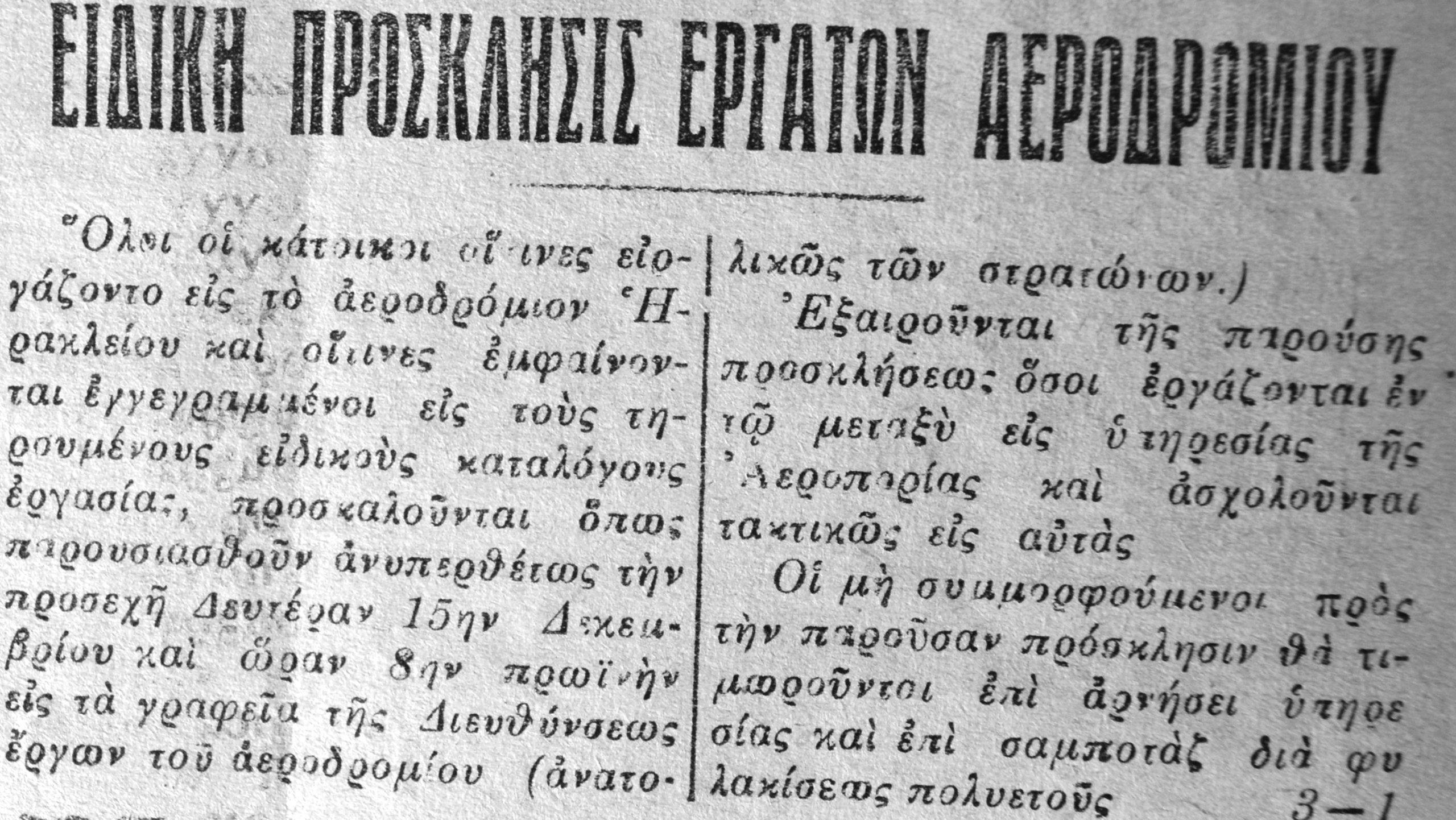 Με απόφασή του, στις αρχές Φεβρουαρίου 1942, ο Φρούραρχος Ηρακλείου αποφασίζει τη διάθεση σιτηρών στους εργάτες της καταναγκαστικής εργασίας που δουλεύουν στα οχυρωματικά γερμανικά έργα του νομού Ηρακλείου, κυρίως στα τρία αεροδρόμια, Καστελλίου, Τυμπακίου και Ηρακλείου.