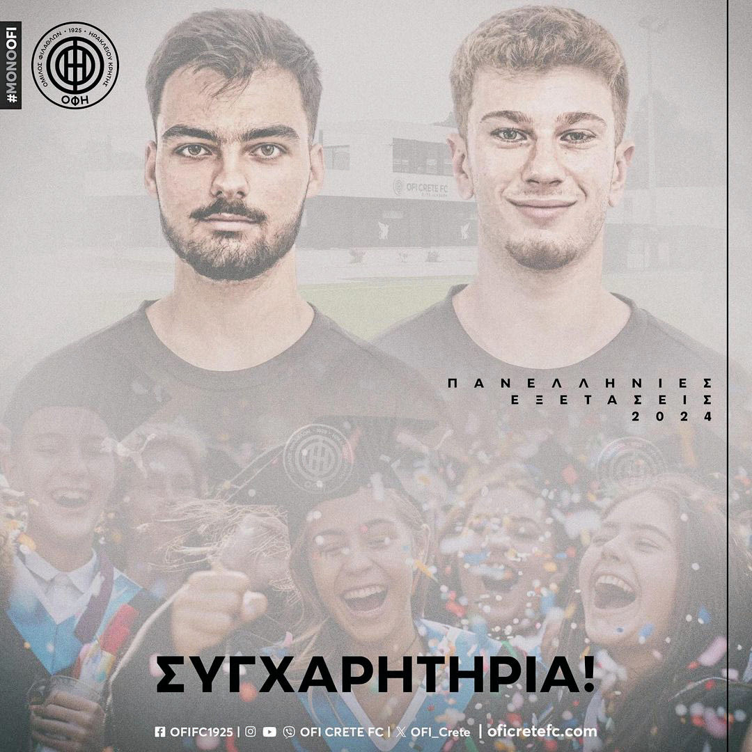 Η ανακοίνωση αναφέρει χαρακτηριστικά: «Συνδυάζοντας με επιτυχία αθλητισμό και σπουδές, δύο ποδοσφαιριστές της Κ19 του ΟΦΗ πέτυχαν τον στόχο τους στις Πανελλήνιες Εξετάσεις και εισήλθαν σε σχολές της τριτοβάθμιας εκπαίδευσης!