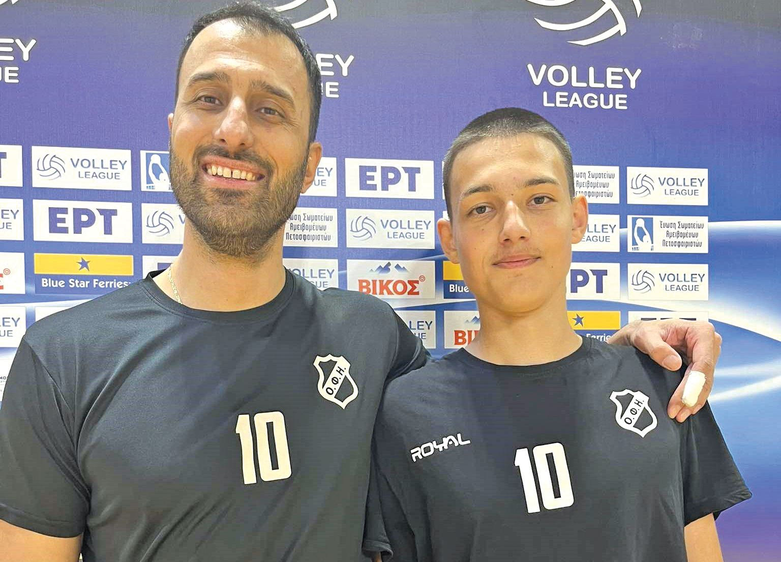Μια ξεχωριστή στιγμή στην προπόνηση της ομάδας βόλεϊ του ΟΦΗ. Πατέρας και γιός προπονήθηκαν μαζί! Ο πολύπειρος κεντρικός Ανδρέας Ανδρεάδης και ο γιος του Βαγγέλης (15 χρ., 1μ99), ακολούθησαν κανονικά το πρόγραμμα της ομάδας.