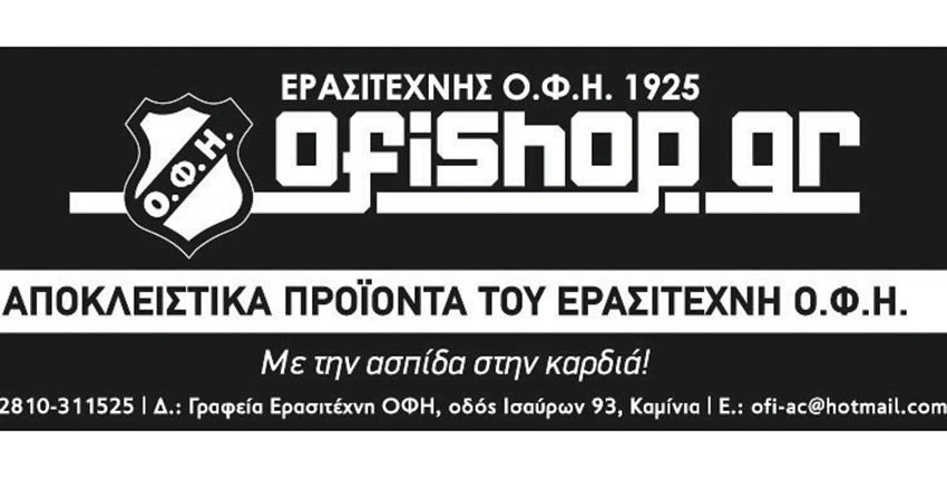 Και εγένετο «ofishop.gr» με αποκλειστικά προϊόντα του Ερασιτέχνη ΟΦΗ. Η μπουτίκ του συλλόγου τίθεται άμεσα στη διάθεση των μελών, προπονητών, αθλητών αλλά και των φιλάθλων της ομάδας.Όπως είχε δεσμευτεί η διοίκηση του συλλόγου, οι φίλαθλοι έχουν πλέον τη δυνατότητα να προμηθεύονται προϊόντα του ΟΦΗ, με το παραδοσιακό σήμα της ασπίδας. Αυτό θα μπορεί να γίνεται είτε από φυσικό κατάστημα (μπουτίκ), είτε ηλεκτρονικά (e-shop), είτε με τηλεφωνικές παραγγελίες. Για περισσότερες πληροφορίες στο τηλ. 2810-311525 (Γραφεία Ερασιτέχνη ΟΦΗ).