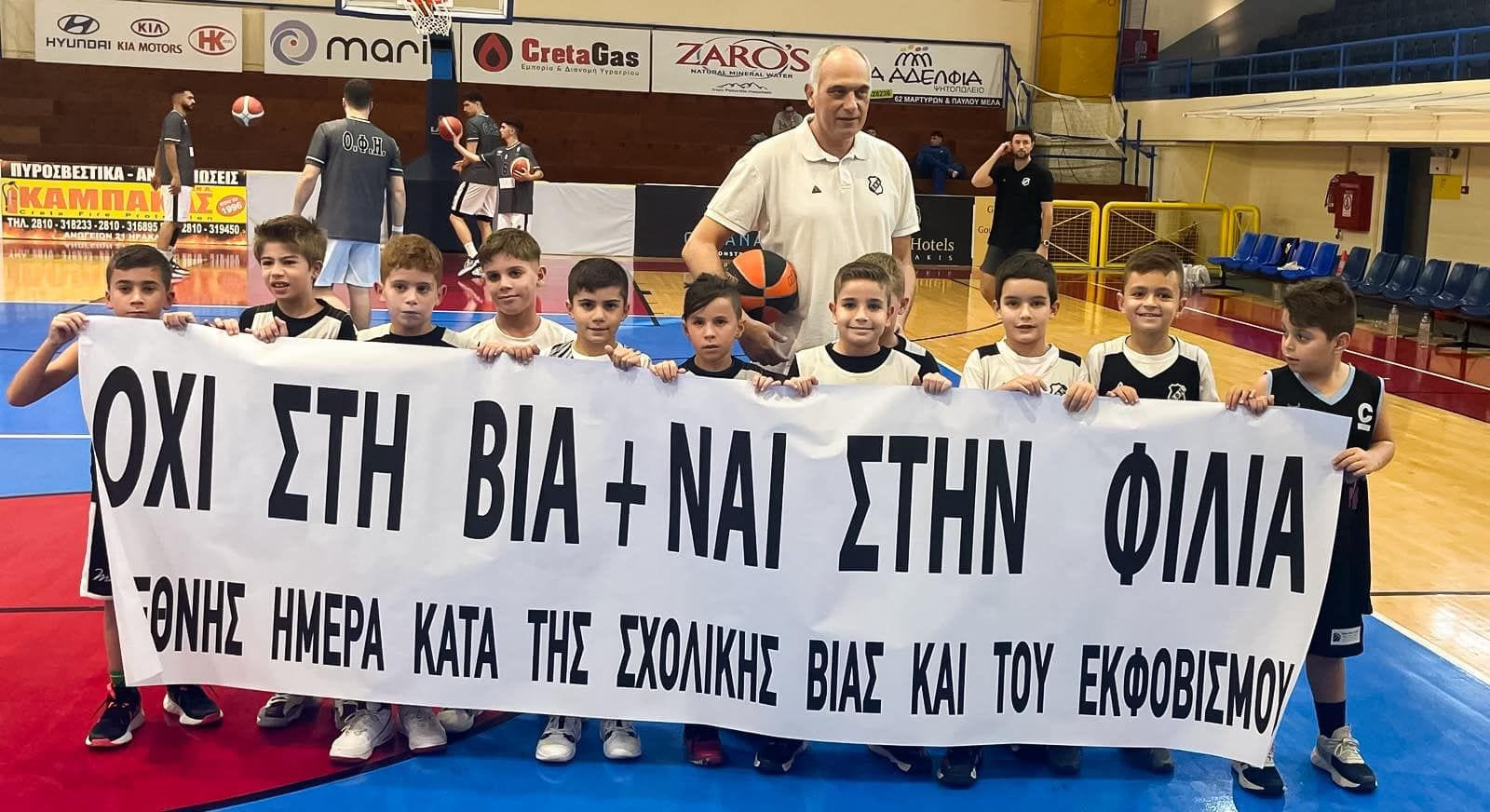 Σε μια συγκινητική στιγμή στο ημίχρονο της αναμέτρησης του ΟΦΗ με τον Εσπερο, οι μικροί αθλητές της Ακαδημίας των γηπεδούχων βγήκαν στο παρκέ και έπαιξαν μπάσκετ, προσφέροντας χαμόγελα στο κοινό. Με αφορμή την Παγκόσμια Ημέρα κατά της Βίας και του σχολικού εκφοβισμού, τα παιδιά της Ακαδημίας ύψωσαν πανό με το μήνυμα: «Όχι στη Βία, Ναι στη Φιλία». Νωρίτερα, τα παιδιά είχαν δημιουργήσει τις δικές τους ζωγραφιές, μεταφέροντας μηνύματα κατά της βίας και υπέρ της φιλίας και της αλληλεγγύης. Δυστυχώς όμως οι ιαχές τους από την κερκίδα δεν… ξύπνησαν τους παίκτες του ΟΦΗ.