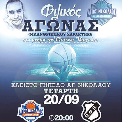 Η μνήμη του δολοφονημένου Αντώνη Καρυώτη, θα τιμηθεί αυτή την Τετάρτη 20 Σεπτεμβρίου, με ένα τουρνουά μπάσκετ στον Άγιο Νικόλαο. Η τοπική ομάδα θα αντιμετωπίσει τον ΟΦΗ (8μμ) ενώ νωρίτερα (6μμ) θα διεξαχθεί φιλικό ανάμεσα στους βετεράνους Λασιθίου και Ηρακλείου.Ο σκοπός είναι πολύ σημαντικός, καθώς όλα τα έσοδα των αγώνων (είσοδος 5€) θα διατεθούν στην οικογένεια του αδικοχαμένου Αντώνη.