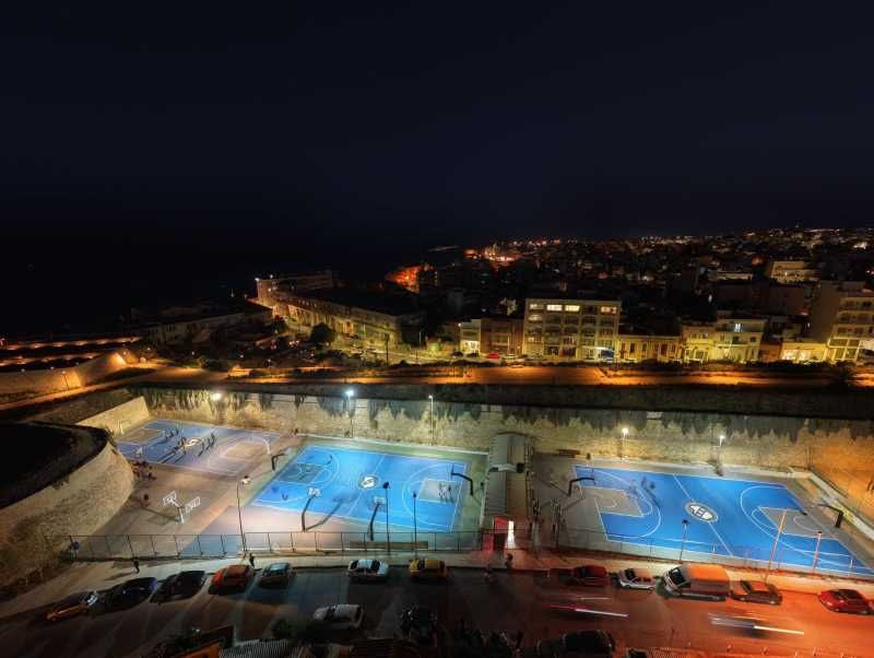 Υπέροχη πραγματικά, η εικόνα από ψηλά στα ανακαινισμένα γήπεδα μπάσκετ του ΟΦΗ, στην οδό Εφόδου. Αυτή η μεγάλη κυψέλη του αθλητισμού, σε συνδυασμό με τα ιστορικά τείχη της πόλης, συνθέτουν ένα πανέμορφο σκηνικό!