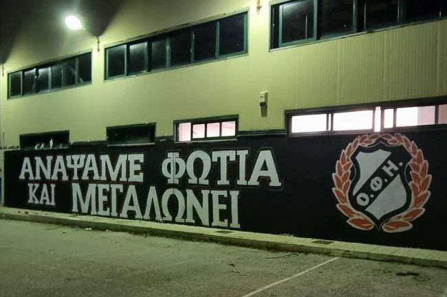 Ένα υπέροχο γκράφιτι, ζωγράφισαν οι συνδεσμίτες του ΟΦΗ, στον τοίχο του κλειστού γυμναστηρίου του Βαρδινογιάννειου Αθλητικού Κέντρου, στο περιθώριο του πάρτι που διοργάνωσαν παραμονές του τελικού του Κυπέλλου Ελλάδας. Με σύνθημα τη φράση (ποια άλλη) «ανάψαμε φωτιά και μεγαλώνει», αλλά και την ασπίδα, οι συνδεσμίτες, έντυσαν με τα χρώματα του ΟΦΗ, το Κλειστό.