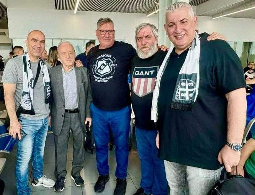 Στην φωτογραφία, ο Κώστας Καζανάκης, με τον πρόεδρο του Ερασιτέχνη ΟΦΗ, Γιάννη Δανδάλη, τον ταμία του συλλόγου Γιάννη Κουμπενάκη, τον επικεφαλής του εμπορικού τμήματος Μένανδρο Παντελλίδη και τον ένθερμο φίλο του ΟΦΗ Κώστα Κουμπενάκη, στην αναχώρηση για την Αθήνα. Ν.Μ.