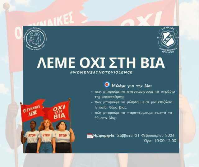 O Ερασιτέχνης ΟΦΗ και ο Σύνδεσμος Μελών Γυναικείων Σωματείων Νομού Ηρακλείου, συνεχίζει τις δράσεις του με μια εκδήλωση με δυνατά μηνύματα, που συνδιοργανώνουν σήμερα, Σάββατο (21/2, 10-12 πμ), στα γραφεία του Ερασιτέχνη ΟΦΗ.