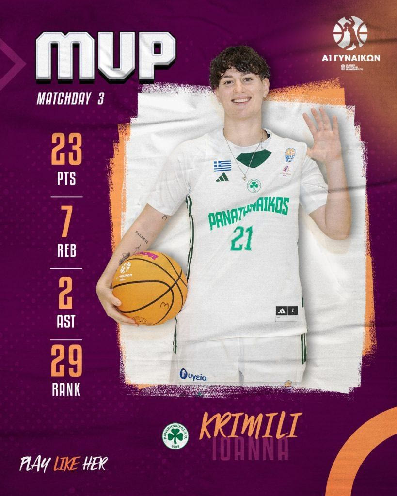 Φοβερό ξεκίνημα έχει κάνει με τη φανέλα του Παναθηναϊκού στην Α1 μπάσκετ γυναικών, η Ιωάννη Κριμίλη. Η διεθνής Ηρακλειώτισσα γκαρντ αναδείχθηκε MVP της 3ης αγωνιστικής, πετυχαίνοντας κόντρα στον Πρωτέα Βούλας, 23 πόντους (7 ριμπάουντ και 2 ασίστ). Η Κριμίλη έχει καλή παρουσία και στα ευρωπαϊκά ματς του τριφυλλιού, με τους ανθρώπους της ομάδας να αισθάνονται ήδη δικαιωμένοι για την επιλογή τους. Υπενθυμίζεται ότι πριν τη μετάβασή της στις ΗΠΑ, η Κριμίλη είχε φορέσει και τη φανέλα του ΠΑΟΚ σε επίπεδο Α1. Μ.Β.