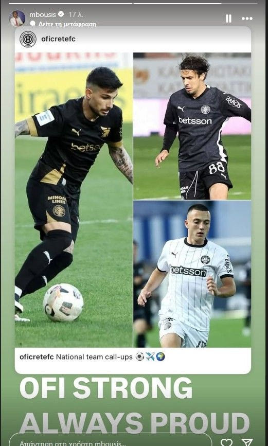 Story στο instagram με αφορμή τις κλήσεις των Ταξιάρχη Φούντα, Μάριο Μπάκιτς και Γιάννη Θεοδοσουλάκη στις εθνικές ομάδες Ελλάδας, Μαυροβουνίου και U21 έκανε ο Μιχάλης Μπούσης. Ο μεγαλομέτοχος της ΠΑΕ κοινοποίησε την ανάρτηση του ΟΦΗ με τους τρεις ποδοσφαιριστές οι οποίοι είναι διεθνείς, γράφοντας παράλληλα στα αγγλικά ««ΟΦΗ δυνατός, πάντα περήφανος» δείχνοντας την υπερηφάνεια του για τους παίκτες της ομάδας που είναι διεθνείς.