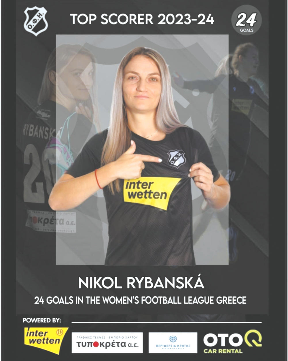 Η Νικόλ Ριμπάνσκα, για δεύτερη συνεχόμενη χρονιά, αναδείχθηκε πρώτη σκόρερ στην Α’ Εθνική Γυναικών, φορώντας τα «ασπρόμαυρα» του ΟΦΗ. Αναμφίβολα, πρόκειται για μία σημαντική διάκριση για την διεθνή αθλήτρια, που πέρυσι αναδείχθηκε πρώτη με 17 τέρματα, ενώ φέτος κατάφερε να σημειώσει 24. Η γυναικεία ομάδα του ΟΦΗ, με ανάρτησή της, συνεχάρη την αθλήτριά της για την επιτυχία της αυτή: «ΠΡΩΤΗ ΣΚΟΡΕΡ Α ΕΘΝΙΚΗΣ 2023-24 TOP SCORER A FOOTBALL LEAGUE 2023-24 Nikol Rybanská 24 γκολ Συγχαρητήρια Nikol γι’ αυτή τη μεγάλη προσωπική και ομαδική επιτυχία για δεύτερη συνεχόμενη χρονιά! Είμαστε περήφανοι για σένα! Gratulujeme Nicole k tomuto skvelému osobnému a timovému úuspechu uzž druhý rok po sebe! Sme na teba hrdi! Congratulations Nikol Ka».