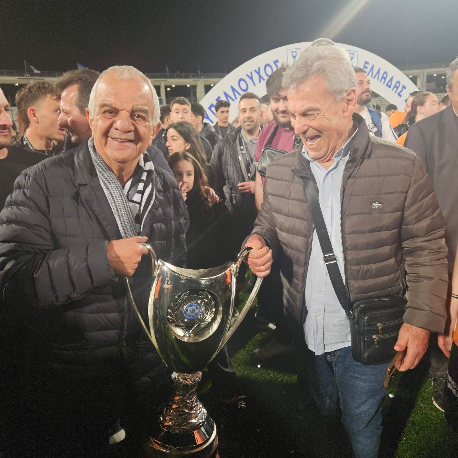 Την τύχη να πανηγυρίσει και να σηκώσει άλλη μια κούπα είχε ο Γιάννης Αδάμης. Ο ιστορικός πρόεδρος του ΟΦΗ 94 είναι πάντα δίπλα στον ΟΦΗ, σε όλες τις στιγμές και δεν θα μπορούσε να λείψει από το Πανθεσσαλικό, όπου μετά από 39 χρόνια γράφτηκε ξανά ιστορία. Στην φωτογραφία καμαρώνει πανευτυχής, κρατώντας το βαρύτιμο τρόπαιο, αμέσως μετά το παιχνίδι μαζί με τον γνωστό Ηρακλειώτη καθηγητή Μανώλη Χριστοδουλάκη… Ν.Μ.