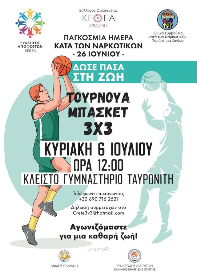 Ο Σύλλογος Αποφοίτων ΚΕΘΕΑ, στο πλαίσιο της Παγκόσμιας Ημέρας κατά των Ναρκωτικών και με στόχο την ενημέρωση, ευαισθητοποίηση και ενεργοποίηση των νέων μέσα από τον αθλητισμό ως υγιή διέξοδο, διοργανώνει στις 6 Ιουλίου 2025, στο αθλητικο κέντρο του Ταυρωνίτη στα Χανιά, Τουρνουά μπάσκετ 3 on 3 με τίτλο “Δώσε πάσα στην ζωή”.