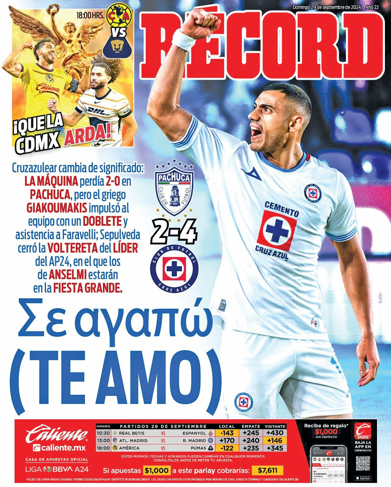 Τα αντίπαλα δίχτυα με γκολ συνεχίζει να «φορτώνει» στο Μεξικό ο Γιώργος Γιακουμάκης. Ο διεθνής επιθετικός σκόραρε δις στο εκτός έδρας ματς της Κρους Αζούλ με την Πατσούκα, ανοίγοντας το δρόμο για την ανατροπή της ομάδας του, καθώς μέχρι και το 55′ που πήρε το «όπλο» του, βρισκόταν πίσω στο σκορ με 2-0. Η Κρους Αζούλ κατάφερε να φύγει με το διπλό (2-4) και να παραμείνει στην κορυφή του πρωταθλήματος. Μάλιστα, ο Γιακουμάκης που είχε και ασίστ στο ματς, φθάνοντας συνολικά τα 5 τέρματα και 3 ασίστ σε 8 παιχνίδια, έγινε πρωτοσέλιδο στην εφημερίδα Record με τίτλο στα ελληνικά «Σε αγαπώ»!! Μ.Β.