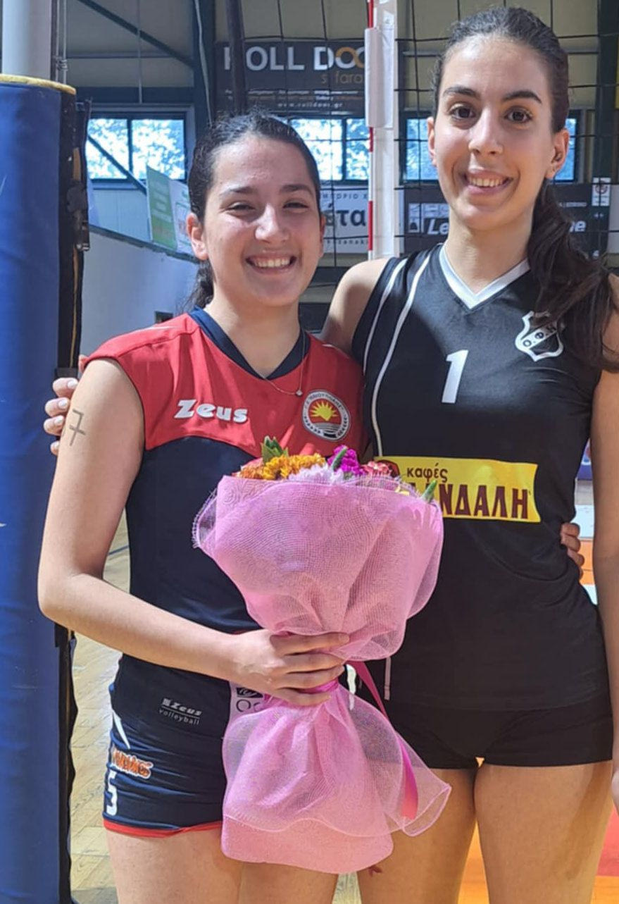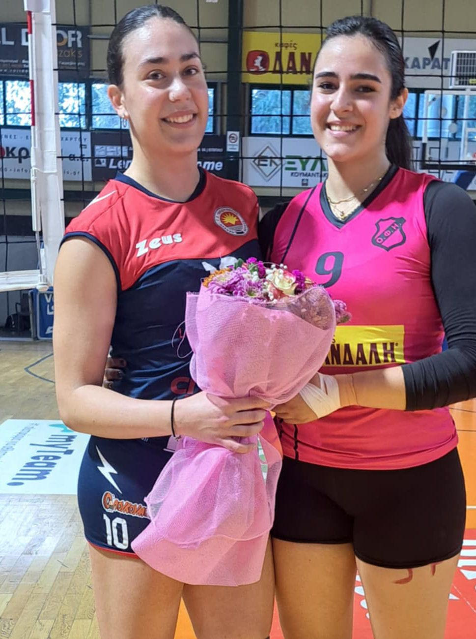 Δύο πρώην αθλήτριές που φέτος αγωνίζονται στην Ηλιούπολη, υποδέχθηκε ο ΟΦΗ στο ματς του περασμένου Σαββάτου για την Α2 βόλεϊ. Ο λόγος για την Ελένη Καλουτσάκη και την Ιωάννα Κοτζεδάκη που συνδυάζουν τις σπουδές τους στην Αθήνα, με το άθλημα που αγαπούν. Στα δύο κορίτσια δόθηκαν ανθοδέσμες από τις πρώην συμπαίκτριές τους. Αξίζει να σημειωθεί ότι οι αθλήτριες και των δύο ομάδων αγωνίστηκαν έχοντας στο μπράτσο τους τον αριθμό 57, τιμώντας έτσι τα θύματα των Τεμπών.