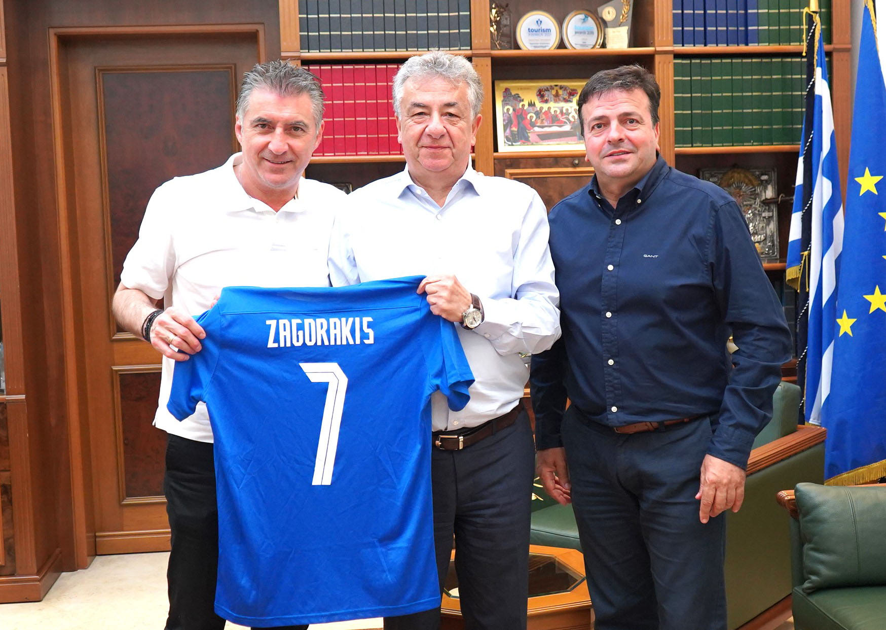 Ο νυν και εκ νέου υποψήφιος ευρωβουλευτής με το ΠΑΣΟΚ-ΚΙΝΑΛ Θοδωρής Ζαγοράκης επισκέφθηκε τον Περιφερειάρχη Κρήτης Σταύρο Αρναουτάκη. Παρουσία του Αντιπεριφερειάρχη Ηρακλείου Νίκου Συριγωνάκη, ο κ. Ζαγοράκης -που βρίσκεται στο Ηράκλειο ως προσκεκλημένος της ΕΠΣΗ για το φάιναλ φορ του Κυπέλλου-συζήτησε με τον Περιφερειάρχη το πλαίσιο των αναπτυξιακών προγραμμάτων της Ε.Ε. για την περαιτέρω προαγωγή του αθλητισμού. Στο τέλος της συνάντησης, ο σπουδαίος παλαίμαχος ποδοσφαιριστής χάρισε στον Περιφερειάρχη τη φανέλα με το νούμερο 7 που φορούσε όταν έπαιζε στην Εθνική.