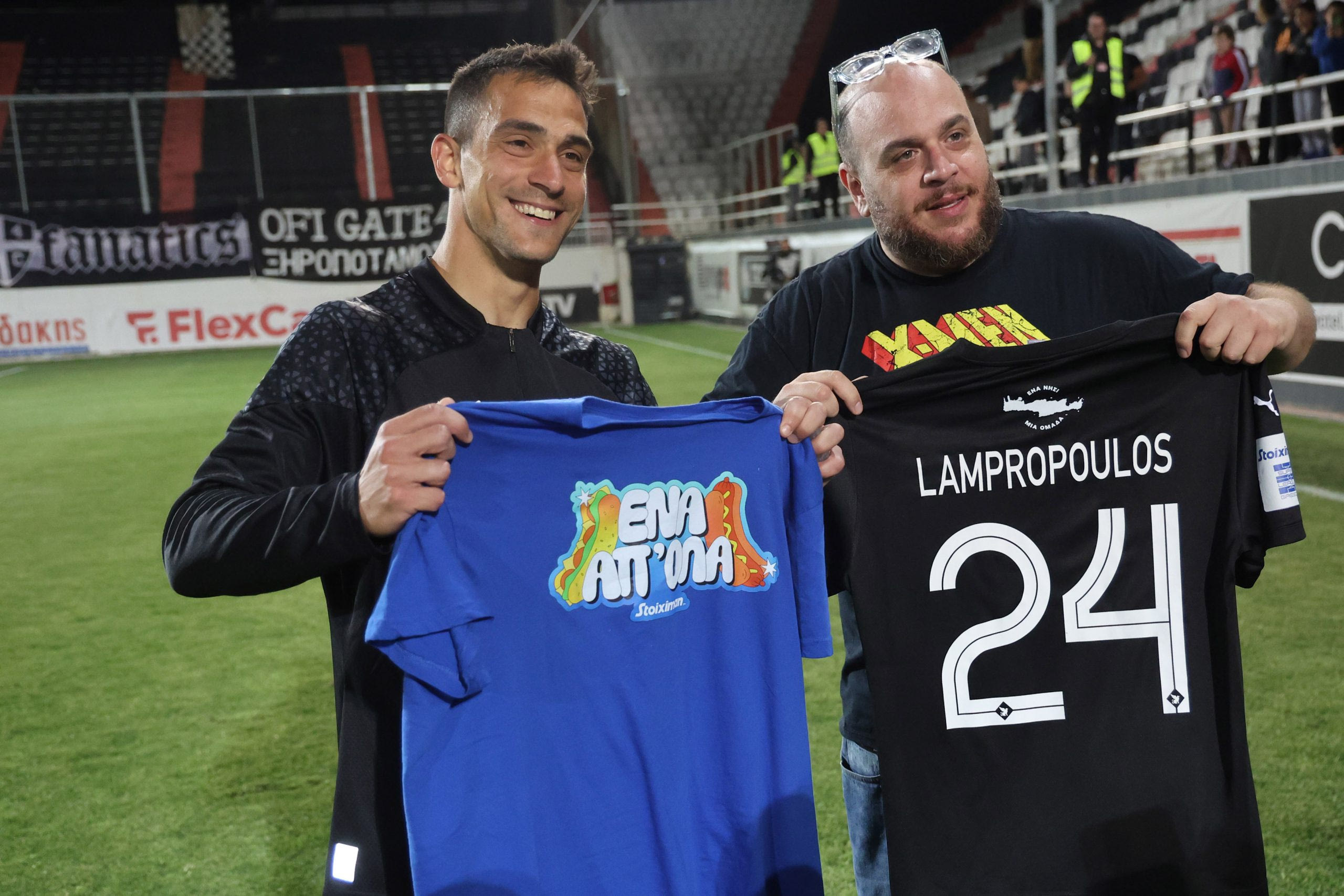 Στο “Γεντί Κουλέ” βρέθηκε το Σάββατο ο γνωστός ραδιοφωνικός παραγωγός Φάνης Λαμπρόπουλος, ο οποίος κάνει γυρίσματα όλη την χρονιά για την Σούπερ Λιγκ. Μάλιστα φωτογραφήθηκε με τον αμυντικό του ΟΦΗ Ανδρέα Λαμπρόπουλο ενώ πήρε και την φανέλα του χωρίς πάντως οι δυο τους να έχουν κάποια συγγενική σχέση εκτός από την συνωνυμία…