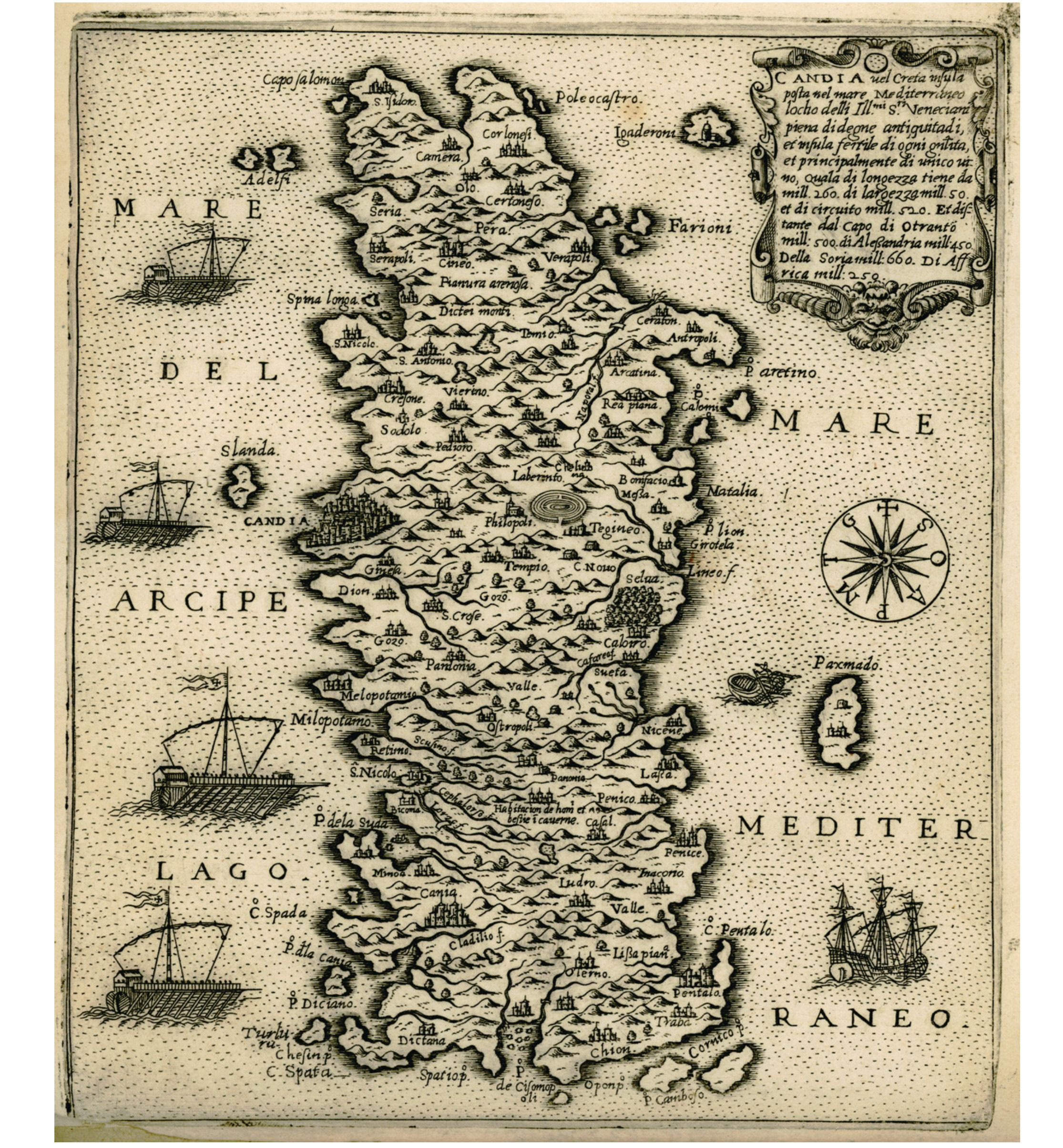 Δύο από αυτούς, Βενετοί και οι δύο, ο εκδότης και χαράκτης Giovanni Francesco Camocio το 1574 και ο γεωγράφος και γιατρός Giuseppe Rosaccio το 1598, αποτύπωσαν μεταξύ άλλων, ως μέρος των φημισμένων ταξιδιών τους στην Ανατολή, σε μικρά χαρτογραφικά τεμάχια από χαλκό, και τον χάρτη της Κρήτης. Με διαφορά μια εικοσιπενταετίας και οι δυο τους, στα έργα τους, σχεδίαζαν πόλεις, οικισμούς, φρούρια και άλλες ενδιαφέρουσες θέσεις του Βασιλείου της Κρήτης (Candia) της Δημοκρατίας του Αδρία.