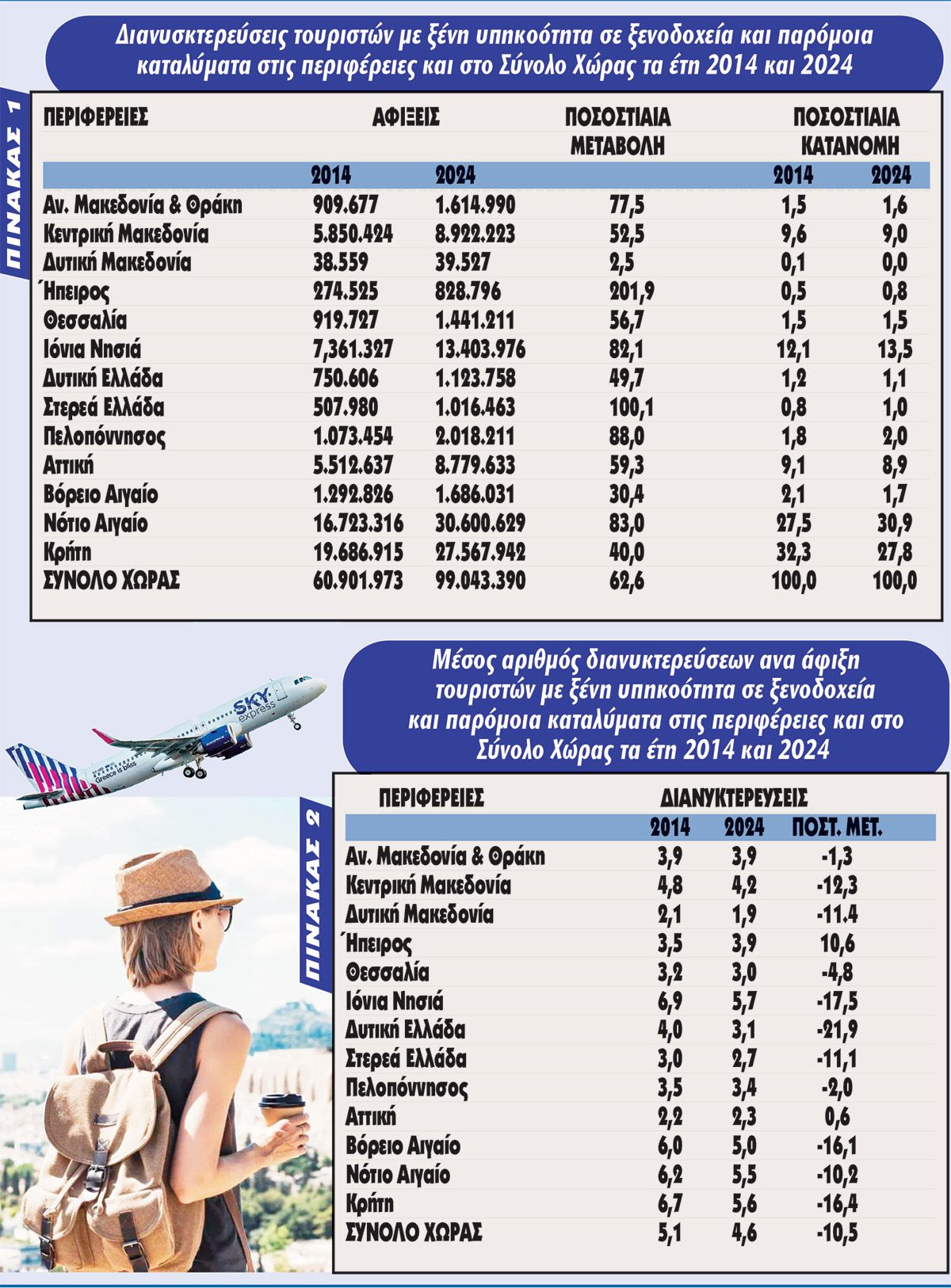 -Τόσο το 2014 όσο και το 2024 τις 4 πρώτες θέσεις σε διανυκτερεύσεις ανά άφιξη (πάνω από 6 το 2014 και πάνω από 5 το 2024 κατείχαν κατά σειρά τα Ιόνια Νησιά, η Κρήτη, το Νότιο Αιγαίο και το Βόρειο Αιγαίο. Την 5η θέση, κατέχει η Κεντρική Μακεδονία).