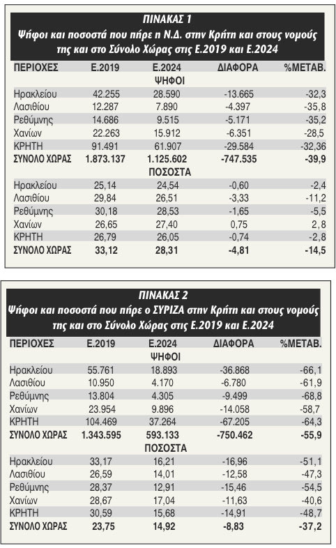 Στο πρώτο και στο δεύτερο μέρος των Πινάκων 1 και 2 δίνονται οι ψήφοι και τα ποσοστά που πήραν, αντίστοιχα, η Ν.Δ. και ο ΣΥΡΙΖΑ στις Ε.2019 και Ε.2024, οι διαφορές τους και η ποσοστιαία μεταβολή τους.