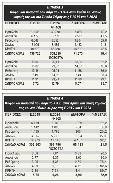 Στους Πίνακες 3 και 4 δίνονται τα αποτελέσματα σε ψήφους και ποσοστά, αντίστοιχα, του ΠΑΣΟΚ και του Κ.Κ.Ε στις Ε.2019 και Ε.2024, οι διαφορές τους και η ποσοστιαία αύξησή τους.