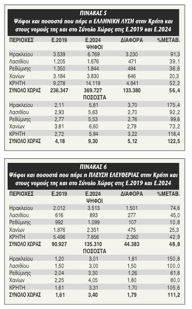 Στους Πίνακες 5 και 6 δίνονται τα αποτελέσματα σε ψήφους και ποσοστά, αντίστοιχα, της ΕΛΛΗΝΚΗΣ ΛΥΣΗΣ και της ΠΛΕΥΣΗΣ ΕΛΕΥΕΡΙΑΣ στις Ε.2019 και Ε.2024, οι διαφορές τους και η ποσοστιαία αύξησή τους. Από τους Πίνακες 5 και 6 φαίνεται ότι στις Ε.2024 σε σχέση με τις Ε.2019 η δύναμη: