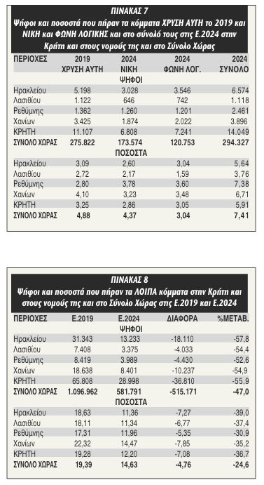 -Στον Πίνακα 7 δίνονται τα αποτελέσματα της ΧΡΥΣΗΣ ΑΥΓΗΣ στις Ε.2019 και της ΝΙΚΗΣ και της ΦΩΝΗΣ ΛΟΓΙΚΗΣ και του συνόλου τους στις Ε.2024, και στον Πίνακα 8 οι ψήφοι των ΛΟΙΠΩΝ κομμάτων (δηλαδή εκείνων που δεν ξεπέρασαν το 3% και δεν εξέλεξαν Ευρωβουλευτή) στις Ε.2019 και Ε.2024, οι διαφορές τους και η ποσοστιαία μεταβολή τους.