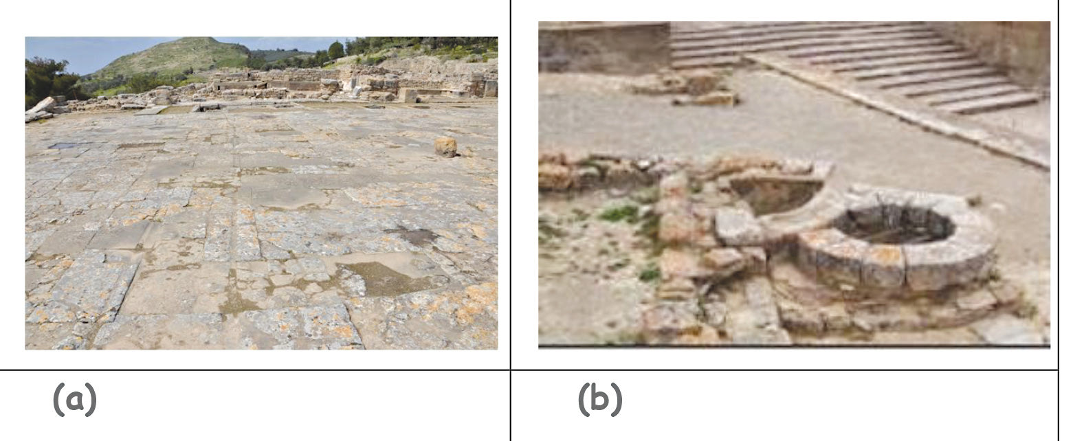 Σύστημα ύδρευσης του ανακτόρου της Φαιστού: (α) ανοιχτή αυλή και (β) ειδική δεξαμενή με φίλτρο χοντρής άμμου για τον καθαρισμό του νερού πριν την αποθήκευσή του (Angelakis et al., 2024).
