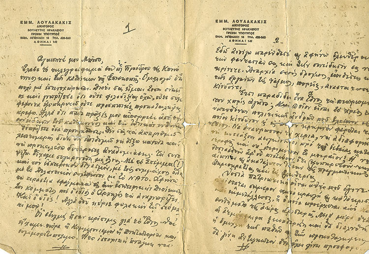 Κάθομαι συνήθως στο καφενείο του Αντώνη. Μου εμπιστεύθηκε το τετράδιο του πατέρα του με εξαιρετικές μαντινάδες και το φυλάσσω στο γραφείο μου πάντα. Προ ημερών μου έδωσε μια επιστολή του τότε βουλευτή Λουλακάκη που απαντά στον τότε πρόεδρο Κοινότητος Δημήτρη Θεοφανάκη. Ο Δημήτρης διαμαρτυρήθηκε για την αποστασία του. Ο βουλευτής ευγενικά προσπαθεί να δικαιολογηθεί. Η αλήθεια είναι ότι οι αποστάτες άνοιξαν τότε με την αποστασία ένα δρόμο ανωμαλίας που μας οδήγησε στην τραγωδία της δικτατορίας. Θα τα παραδώσω στο Ιστορικό Αρχείο. Ίσως κάποιος μελετητής των χρόνων αυτών τα χρησιμοποιήσει.
