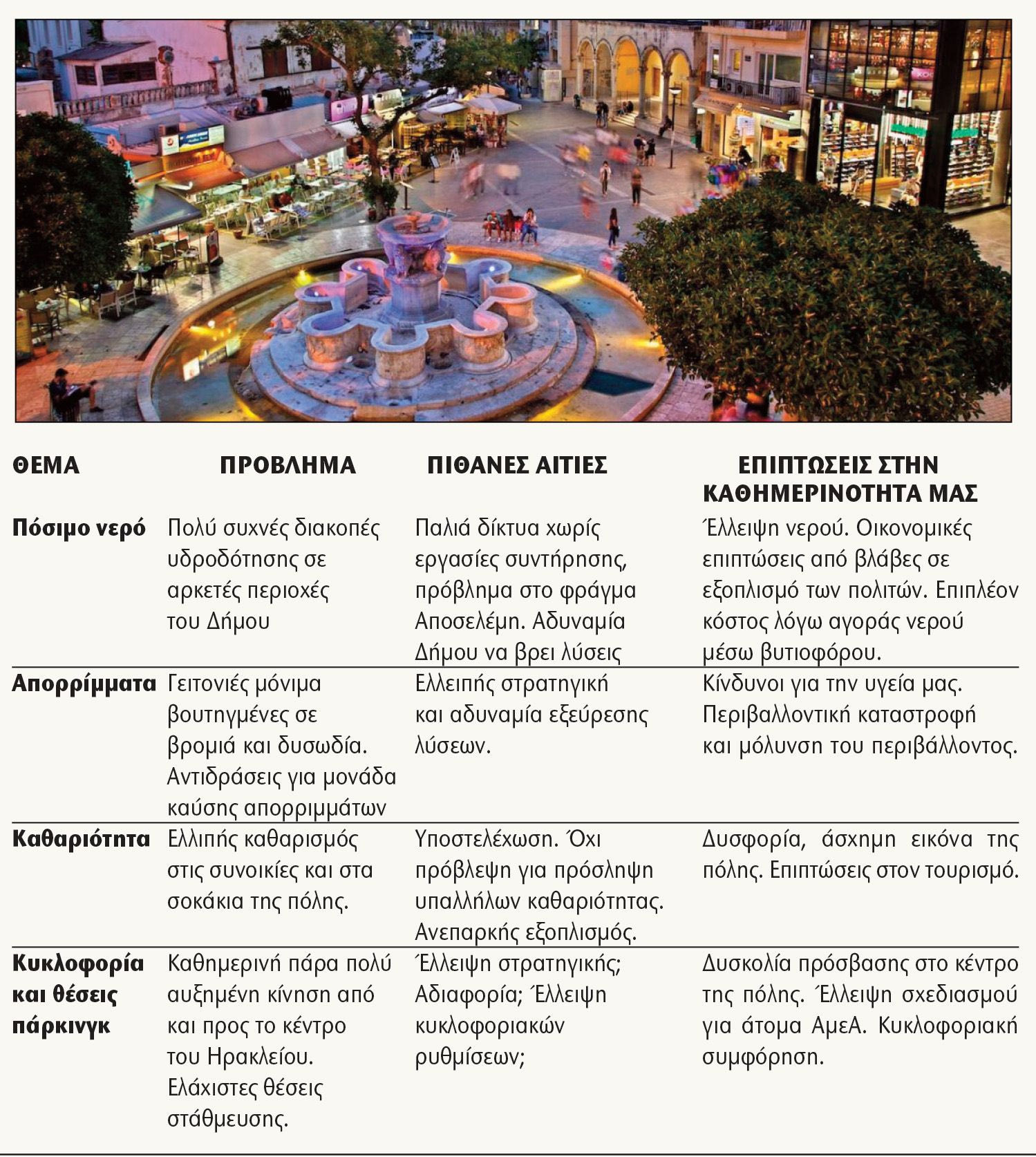 Έκανα μία μικρή έρευνα χρησιμοποιώντας τις πηγές που παραθέτω στο τέλος του άρθρου μου και έφτιαξα πίνακα, με τα πιο σοβαρά προβλήματα που υπάρχουν στον Δήμο Ηρακλείου και έχουν άμεση συνέπεια στις ζωές μας.