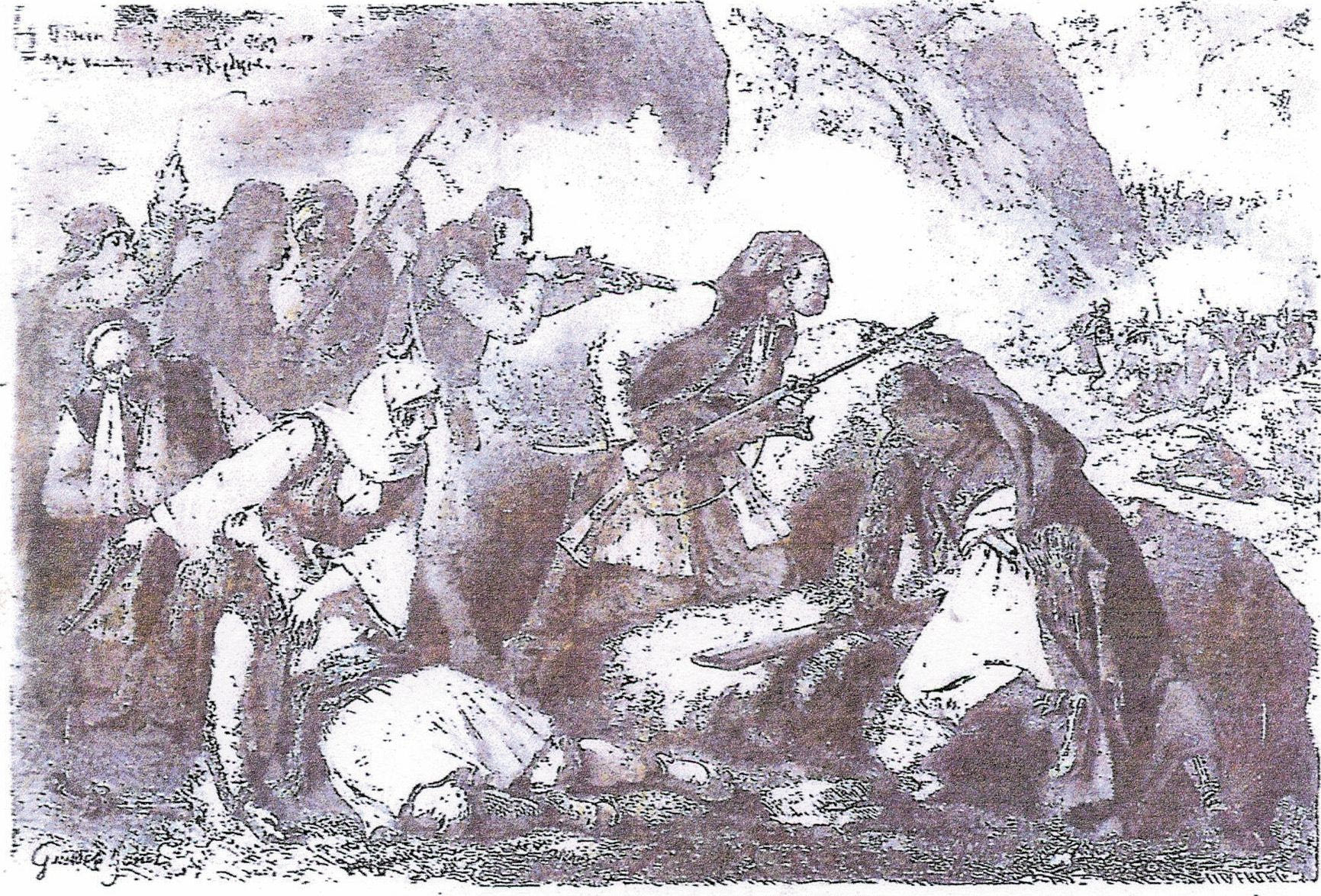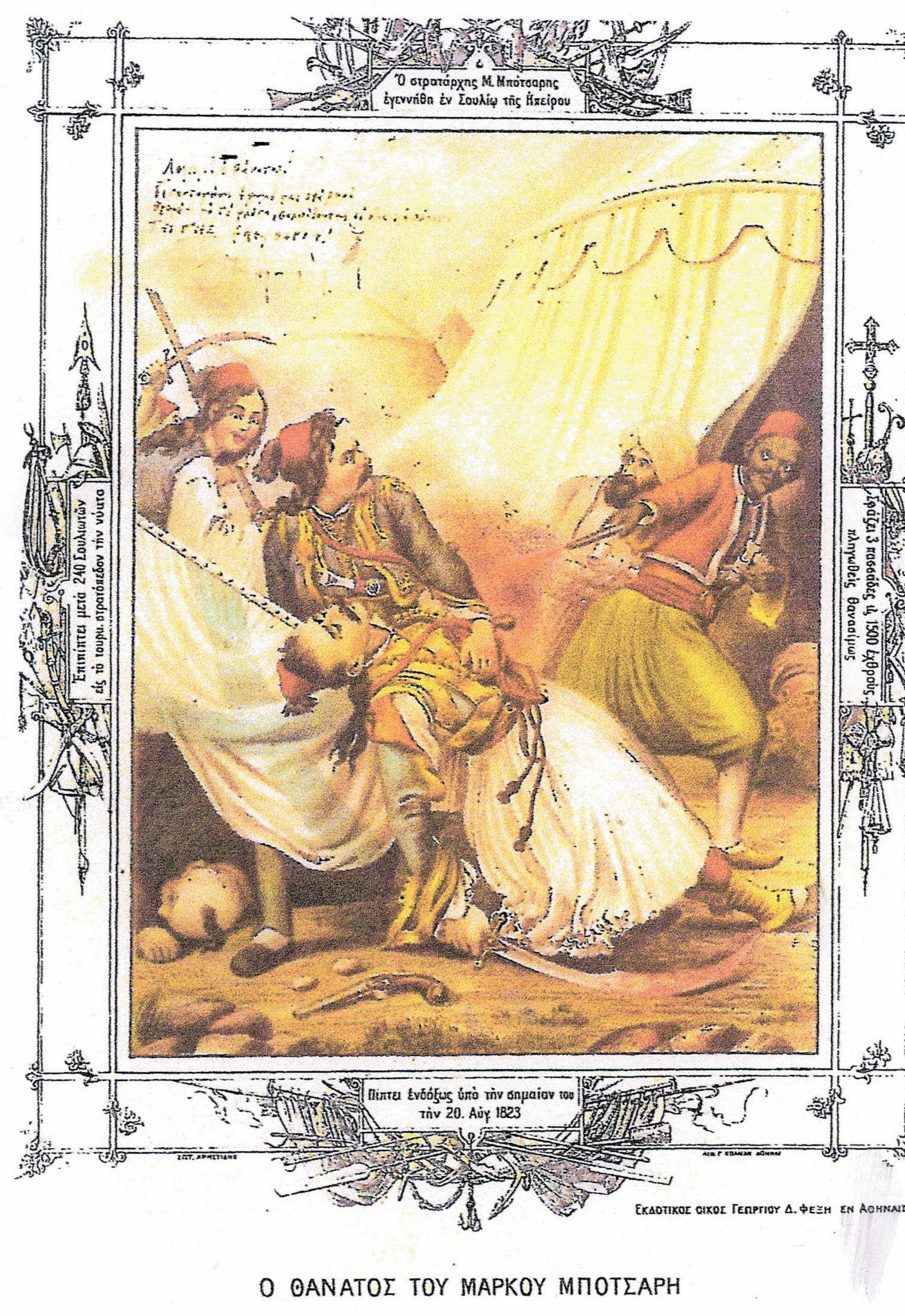 Στη 2η λιθογραφία του Σωτ. Χρηστίδη που εικονίζει τον θάνατο του Μάρκου Μπότσαρη το 1823 αναφέρει:
