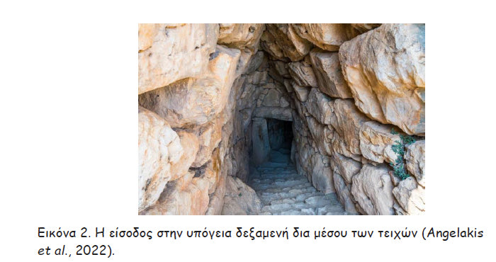 Το νερό προερχόταν κυρίως από μια πηγή ζωτικής σημασίας, την Περσεία, που από τα προϊστορικά χρόνια έως και στις μέρες μας αναβρύζει και υδροδοτεί σύγχρονο χωριό. Η πηγή βρίσκεται 360 m μακριά από τη δεξαμενή, που είναι περίπου 18 m κάτω από το επίπεδο του εδάφους και γι’ αυτό χτίστηκε μια στεγασμένη σκάλα που οδηγεί προς αυτήν, προστατευμένη από τη νέα επέκταση του τείχους (Εικ. 2, Angelakis et al., 2022).
