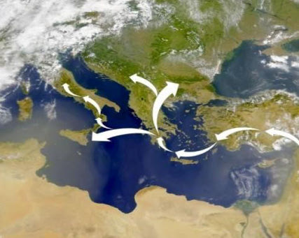 Γενετικοί δείκτες υποδεικνύουν ότι οι νεολιθικοί μετανάστες, που έφεραν τη γεωργία στην Ευρώπη, ταξίδεψαν από το Λεβάντε στην Ανατολία, μετά στην Ελλάδα δια μέσου της Κρήτης και στη συνέχεια στη Σικελία και την υπόλοιπη Ευρώπη (Εικ. 1).