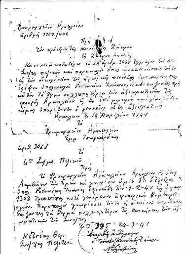 Λαμβάνω την τιμήν να γνωρίσω υμίν ότι ο έφεδρος υπολ. Ροδανάκης Ιωάννης εφονεύθη την 9-2-41 εις ύψωμα 1308 Τρεμπεσίνας κατά γενόμενον αεροπορικόν βομβαρδισμόν. Παρακαλώ γνωρίσατε τούτο εις οικείους του, διαβιβάζοντες τα θερμά συλλυπητήρια της Διοικήσεως των αξιωματικών του Συν/τος.