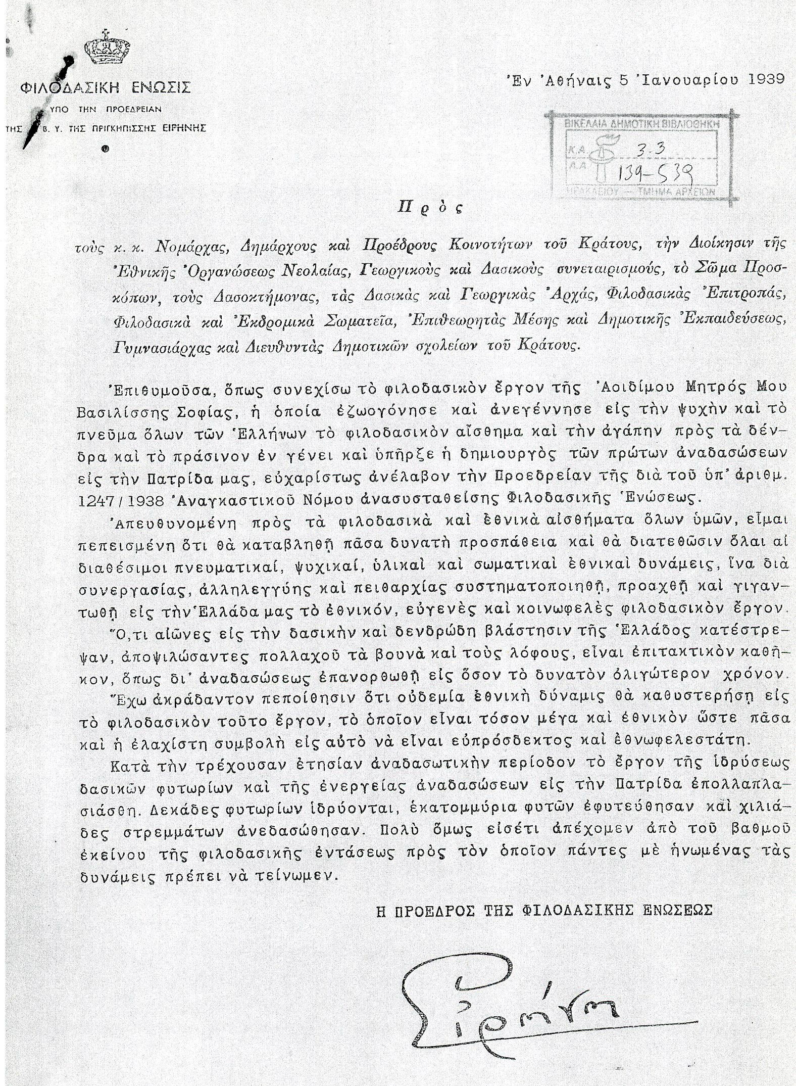 Η ίδια η πριγκίπισσα Ειρήνη, ως πρόεδρος της προαναφερόμενης Ένωσης, με επιστολή της απευθύνεται προς τους νομάρχες, δημάρχους, προέδρους κοινοτήτων, προς την Διοίκηση της Εθνικής Οργάνωσης Νεολαίας, προς τους γεωργικούς και δασικούς συνεταιρισμούς, το σώμα προσκόπων, τους δασοκτήμονες, τις δασικές και γεωργικές Αρχές, προς τις φιλοδασικές επιτροπές, φιλοδασικά και εκδρομικά σωματεία, προς τους επιθεωρητές Μέσης και Δημοτικής Εκπαίδευσης, προς τους γυμνασιάρχες και διευθυντές των δημοτικών σχολείων του κράτους. Το κείμενο, το οποίο αποστέλλει η πριγκίπισσα Ειρήνη, έχει ως εξής: