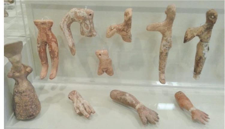 Πήλινα αναθήματα, από τα Μινωικά ‘’ιερά κορυφών’’, ομοιώματα ανθρωπίνων σωμάτων, ανθρωπίνων μελών, (χέρια,πόδια, θώρακες ημιθώρακες, κεφάλια), αναρτούντο σε ικριώματα ή κλάδους ιερών δένδρων. Εκφράσεις ευχαριστιών ή παρακλήσεων; Τα μινωικά αναθήματα παραπέμπουν στα κρεμάμενα τάματα στις χριστιανικές εικόνες.
