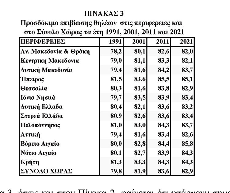 Στην 1η στήλη του Πίνακα 3 δίνεται το προσδόκιμο επιβίωσης θηλέων στις περιφέρειες και στο Σύνολο Χώρας το έτος 1991 στη 2η το 2001 στην 3η το 2011 και στην 4η το 2021.