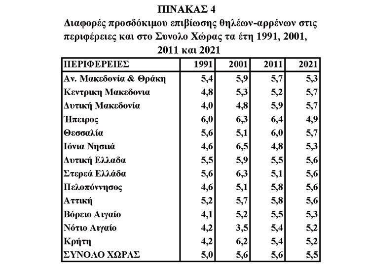 Από τον Πίνακα 4 φαίνεται ότι τα έτη 1991, 2001 και 2011 υπήρχαν σημαντικές διαφορές στη διαφορά του προσδόκιμου επιβίωσης θηλέων -αρρένων. Το 2021, όμως, με εξαίρεση την Ήπειρο, οι διαφορές στις άλλες περιφέρειες ήταν μικρές, Πιο συγκεκριμένα: