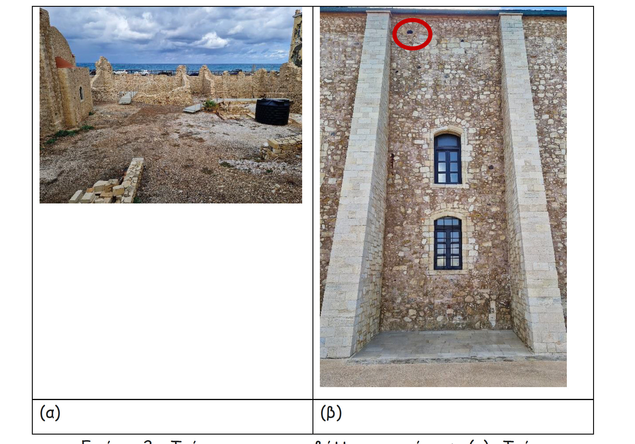 Επίσης ο περιβάλλοντας χώρος θα πρέπει να διευθετηθεί, να συμπληρωθούν οι αναστηλώσεις, που έχουν αρχίσει να γίνονται, να καθαριστεί και να περιφραχτεί επιμελώς (Εικ. 2α). Οι υδρορροές όπως φαίνεται μία στην Εικόνα 2β, πρέπει να συμπληρωθούν για να αποφευχθούν κυρίως οι καταστροφές που προξενεύονται στου τοίχους.